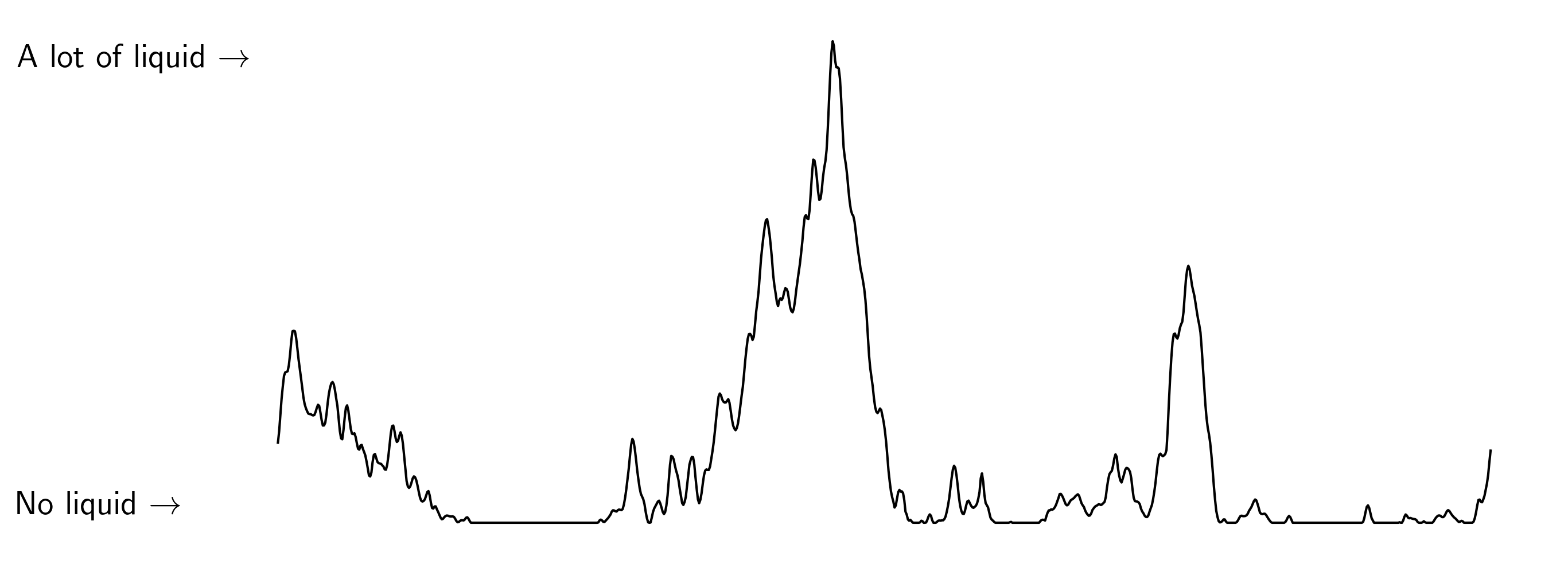Here's an example of what I mean. The below plot is from a cloud simulation,9 and it shows the amount of liquid water as a function of distance along a horizontal path through a cloud field.