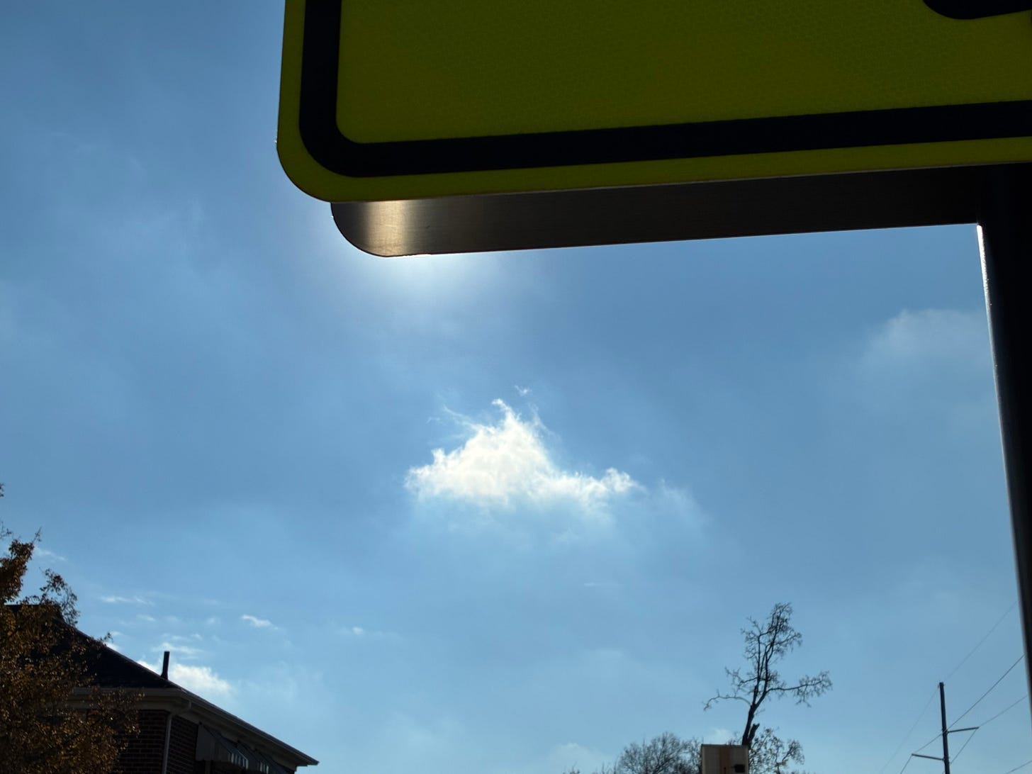 I do think the implications of this problem are beginning to be recognized. An important first step was taken by Ilan Koren and coauthors,7 who simply pointed out that what we normally think of as “clear” sky often has a substantial number of liquid water droplets in it. These droplets can even be seen by the human eye—look closely at the blue sky surrounding small cumulus clouds, particularly while looking toward the sun, and on the right day you’ll see slight variations in the saturation of the blue sky color. Here is an example photo I took the other day, using a sign to block the sun: