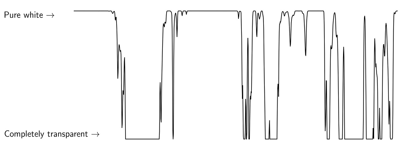 In this case, we see that most regions are either very close to completely transparent or very close to completely opaque, i.e. pure white. The region in the center hits a “ceiling” at pure white — there is much more liquid than necessary to make that region opaque. Most of the variation in liquid water content is invisible because it doesn’t get whiter than white.
