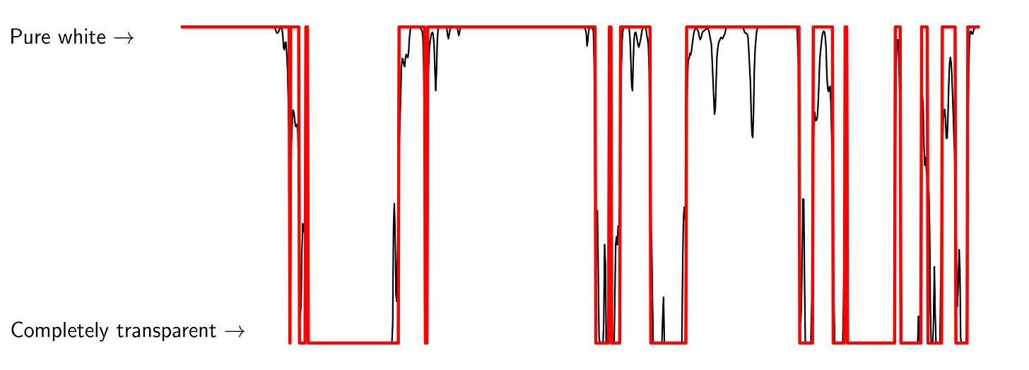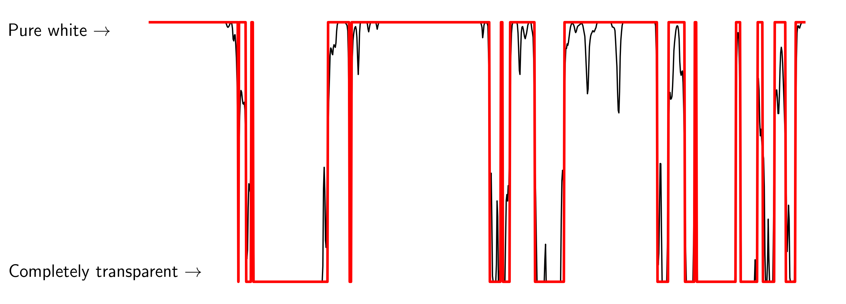 For the transparency plot, we actually can closely approximate the black line with a binary version. Here, the red line, which is only ever two things ("cloudy" or "clear"), follows the black line relatively well: